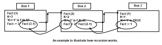 To see how this works, look at the following diagram and then read the description underneath. We want to find out the factorial of 3 so we call the function using the instruction Fact(3). Note that we have drawn a box around each call to the function. This helps us to remember the values of the variables. If you are working in a box then you use any variables’ values in that box!